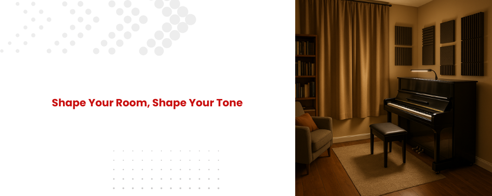 Simple fixes can ruin your acoustics. A rug under the piano will reduce the harsh reflections off the floor. Curtains, cushions and bookshelves add balance by softening hearings. For more advanced setups, you can install acoustic panels or foam on the walls to achieve a professional sound. These little touches make your piano setting at home look more like a music studio.